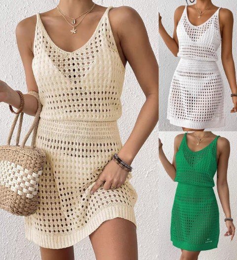 > ミニワンピース ショートワンピ キャミワンピース ノースリーブ 袖なし 透け編み 重ね着 シンプル カジュアル フリー ベージュ