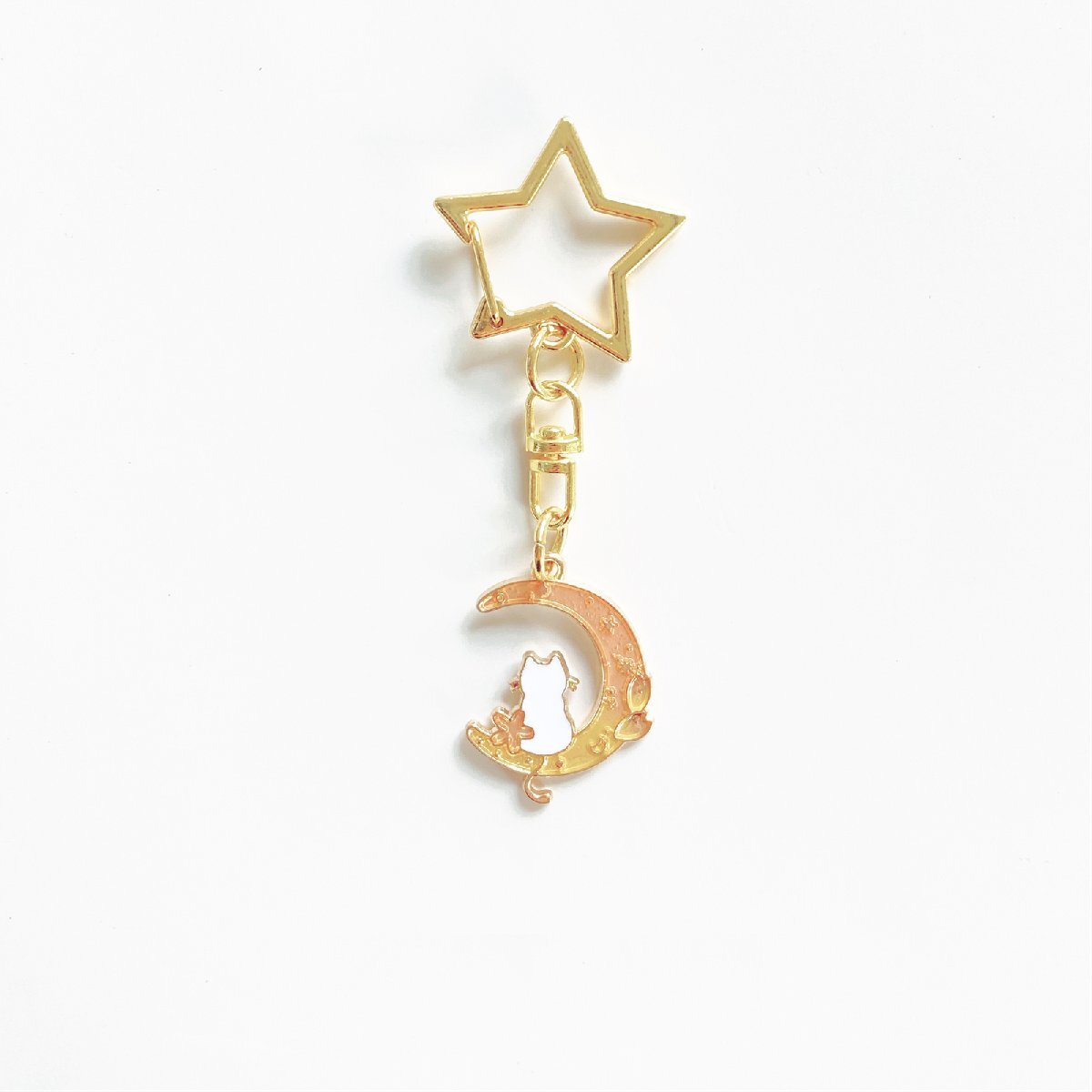 - 手作り オレンジお月様ネコ キーホルダー 星チャーム付き バッグチャ鍵