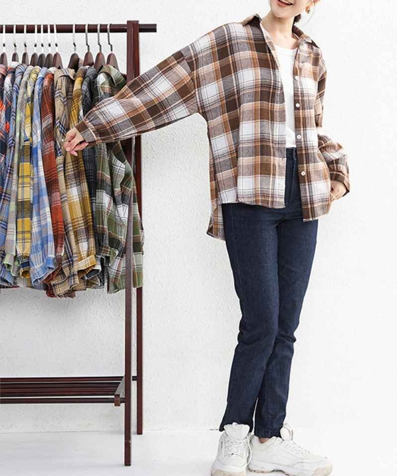 > 長袖シャツ ブラウス チェック柄シャツ 長袖ブラウス 羽織 ストリート風 カジュアル かわいい シンプル ワンサイズ A14