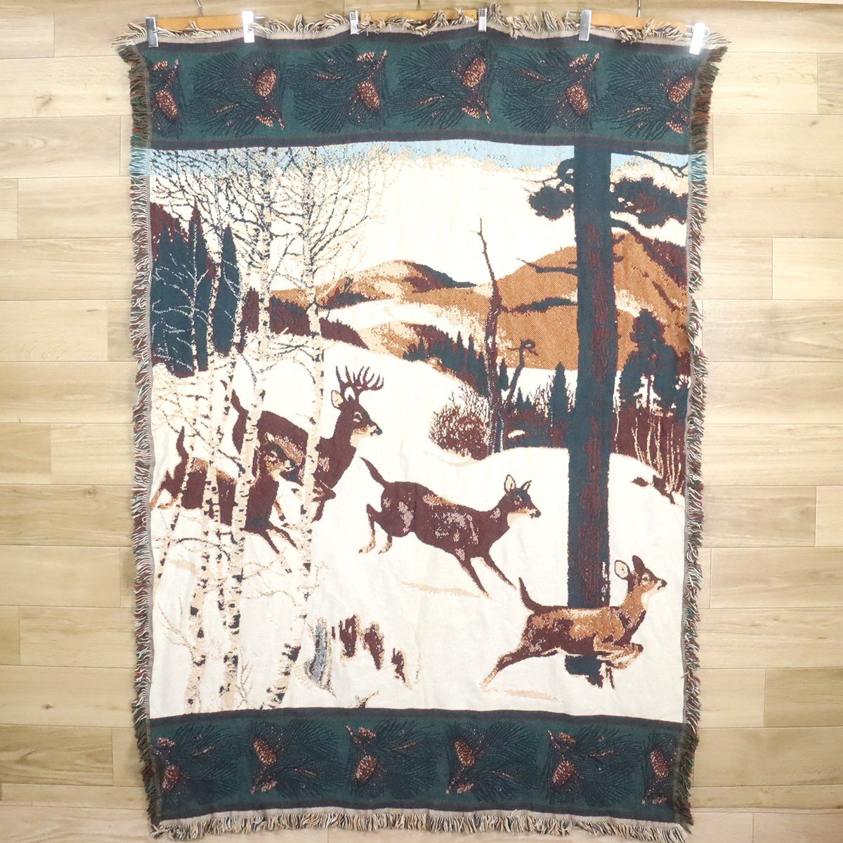 > A1-3 I/D10.24-3 USA製 鹿 シカ 松ぼっくり 雪景色 ラグ マット カーペット ブランケット タペストリー インテリア雑貨 絨毯