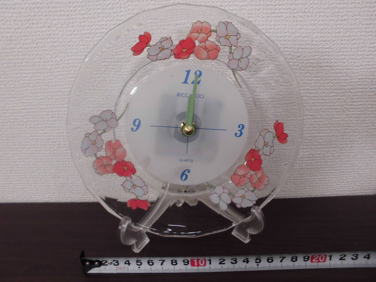 - [S18] 曽根ガラス RICCARDO クオーツ クロック NO.Y9Z 時計 スタンド付 花柄 かわいい アンティーク 動作未確認 ジャンク 中古
