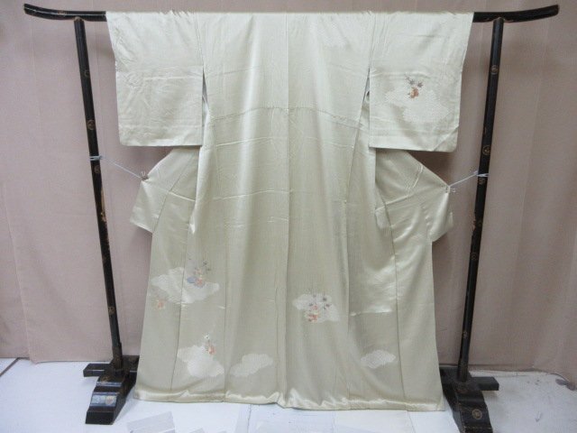 > 1円 良品 訪問着 正絹 着物 縮緬 式典 和装 和服 雲 刺繍 草花 枝花 高級 袷 身丈160cm 裄66cm【夢職】★