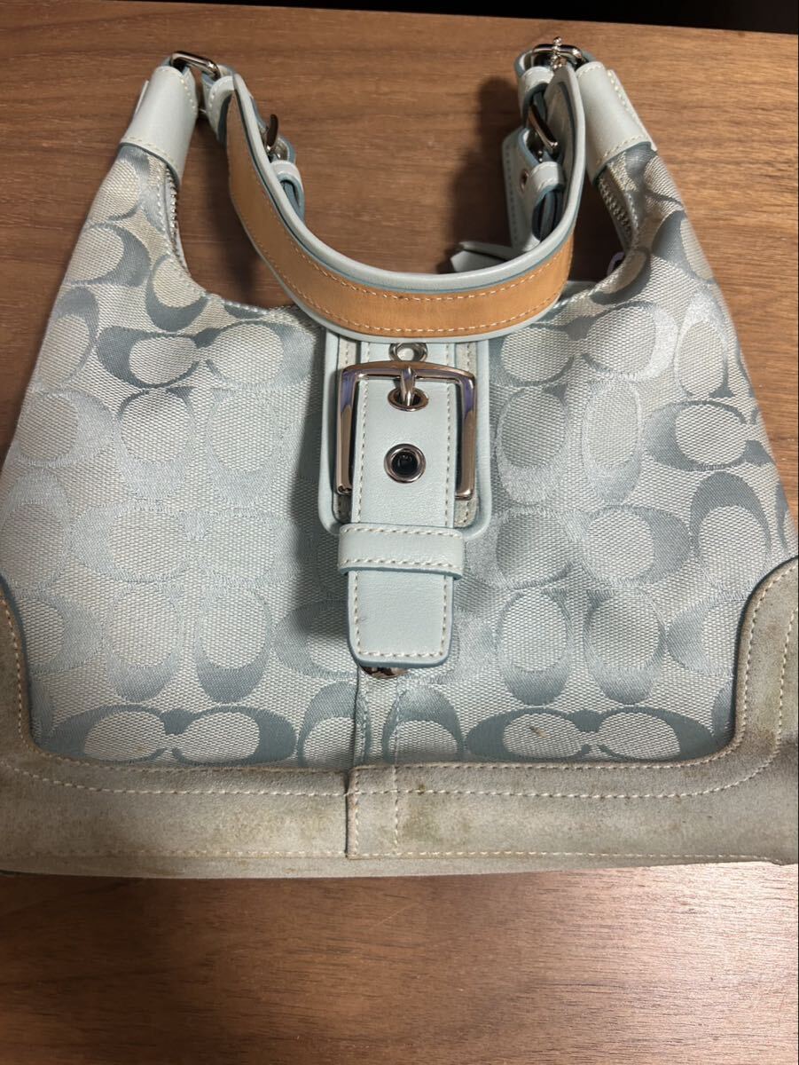 - o COACH コーチ シグネチャー ショルダーバッグ 水色系 キャンバス×スエード