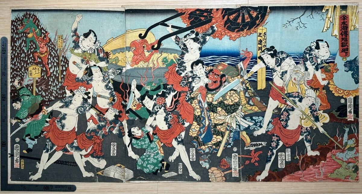 - 【真作】水滸伝地獄廻 3枚続 鬼 妖怪 幽霊 刺青 豊原国周 武者絵 木版画 浮世絵 歌舞伎絵 役者絵 中国唐物唐本 古筆古文書和本 #1561
