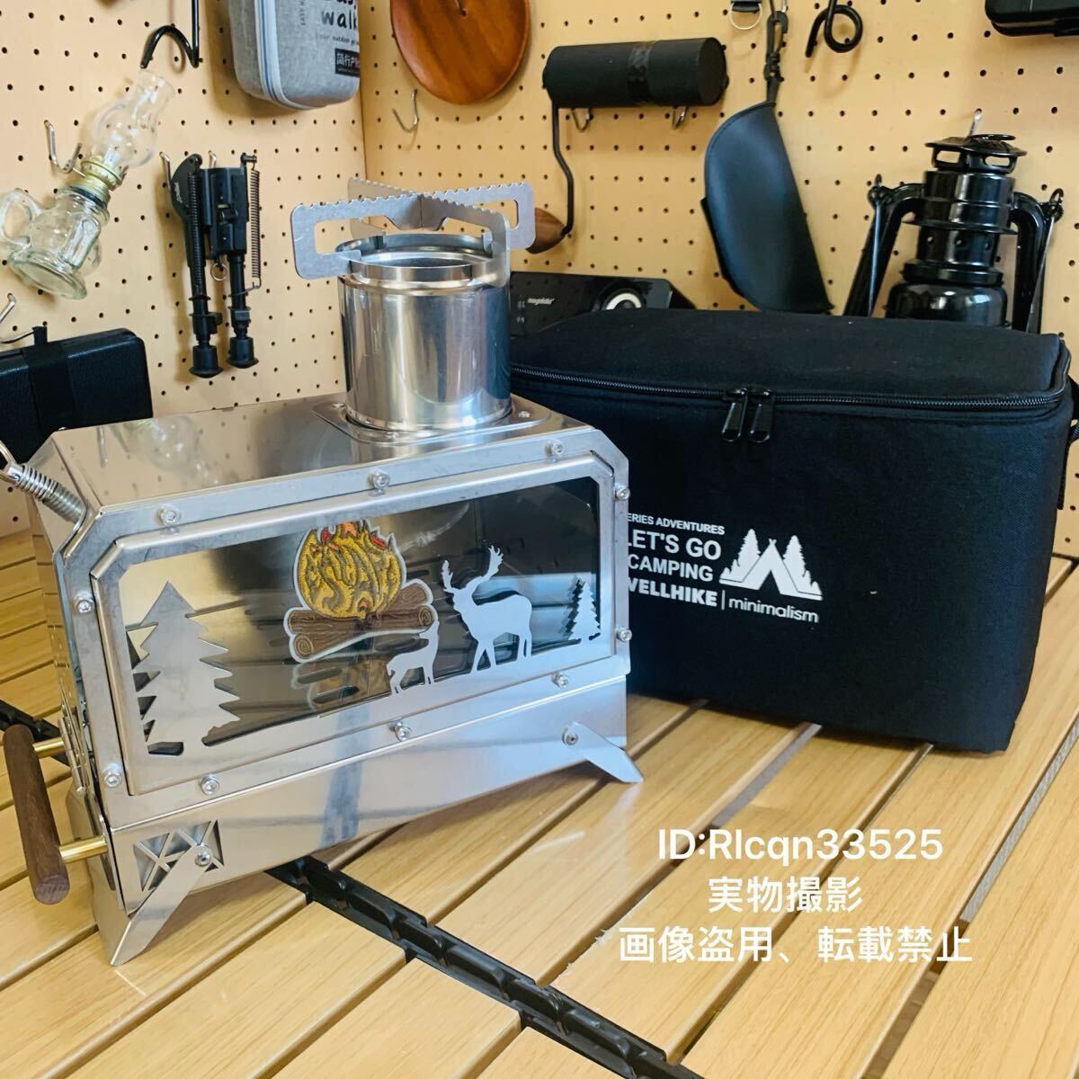 > ステンレス製 キャンプ用 薪ストーブ 小型テーブル暖炉 ガラス窓 卓上焚火 キャンプ 調理器具 28.5×28×14cm 3.5kg 収納ケース付