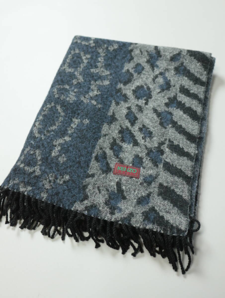 - C220/KENZO/ケンゾー/オールド/ゼブラ柄/総柄/ストール/ショール/マフラー/フリンジ/グレー×ブルー/大判/70×180㎝