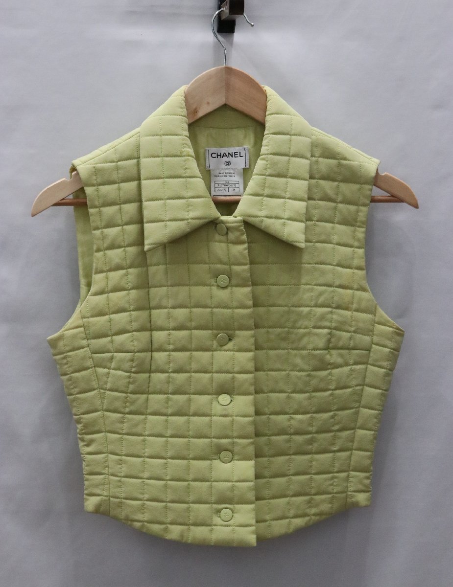 - 【中古美品】CHANEL シャネル ベスト キルティング チョコバー グリーン ノースリーブ ココマーク シルク100% 00S サイズ38 【漂亮】