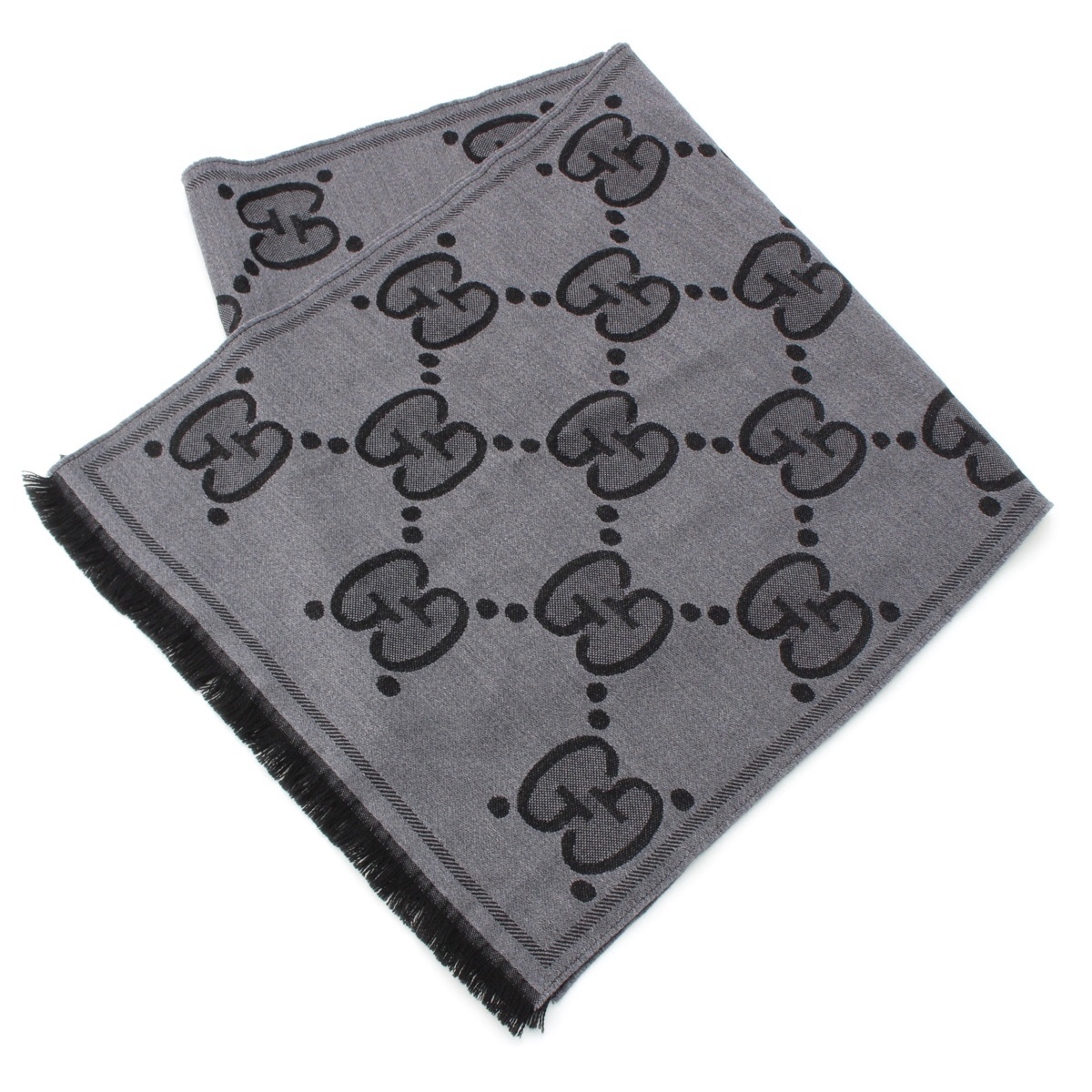 - グッチ ウール ジャンボGG ジャガード フリンジ マフラー 598189 グレー 45×195cm【中古】