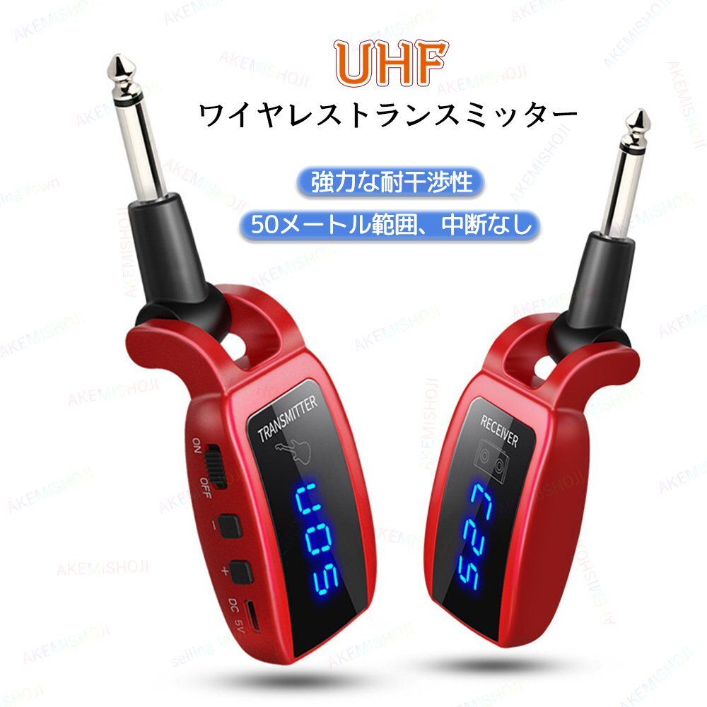 - ギターワイヤレスシステム ワイヤレス 内蔵充電式バッテリー UHF 送受信機 LEDディスプレイ 電量/音量/周波数表示 270°回転 レッド