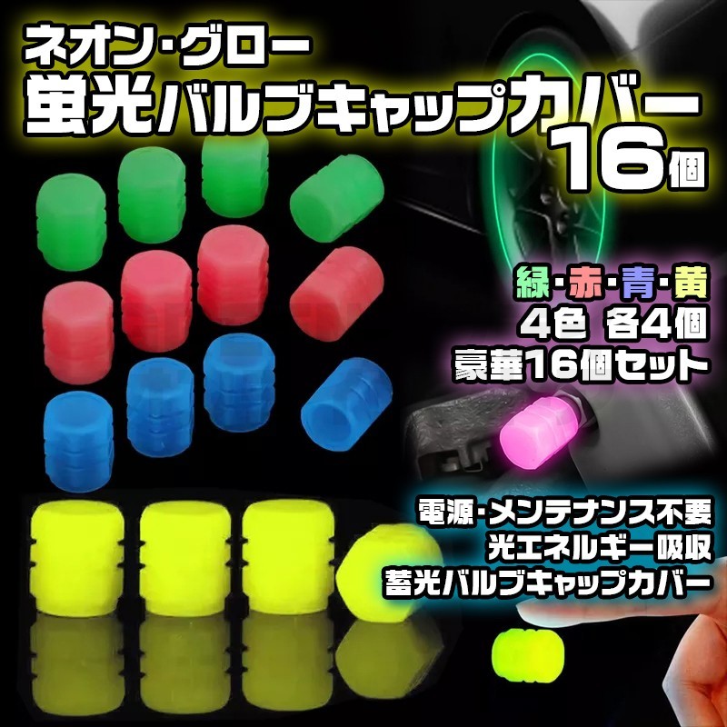 - 蓄光 蛍光 タイヤ バルブキャップ カバー グロー ネオン 4色 各4個 16個