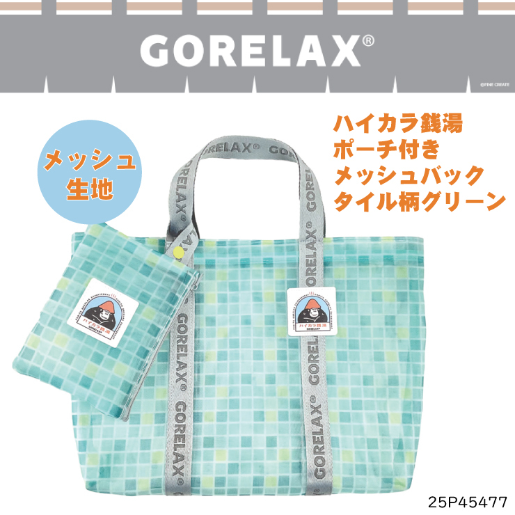 > ごリラックス メッシュトートバッグ グリーン ポーチ付き□25P45477□新品 バッグ タイル柄 バス用品 サウナ 銭湯 ごりらっくす GORELAX Z1