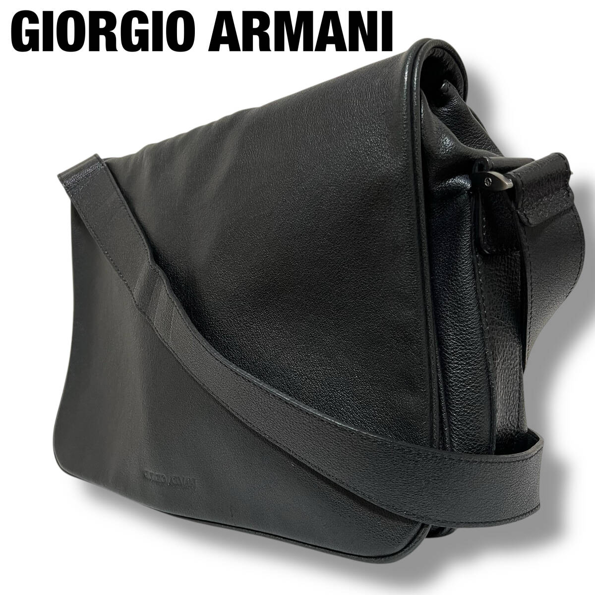 - 美品 GIORGIO ARMANI ジョルジオアルマーニ メッセンジャーバッグ ショルダーバッグ レザー 黒 ブラック A4収納可 ビジネス フラップ