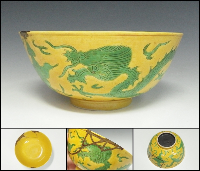 - 【251109-7】明時代 交趾焼黄地緑彩双龍紋碗 唐物民藝古陶磁 古作時代古玩
