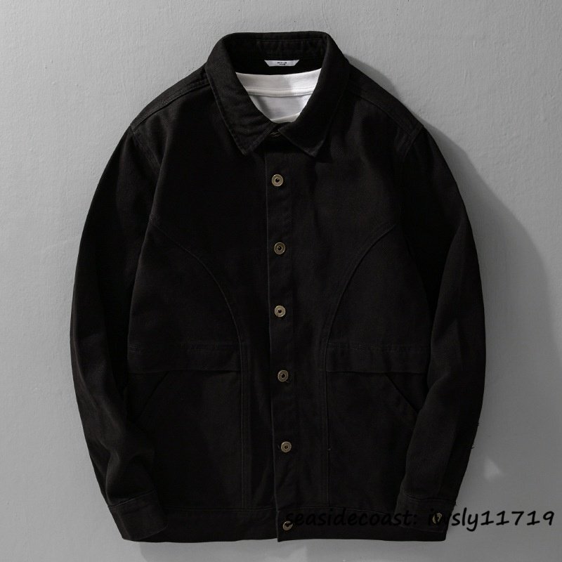 > 春秋新品*ワークシャツ メンズ 無地 長袖シャツ アメカジ ワークジャケット ミリタリー 古着風 アウター ジャンパー ゆったり ブラック L