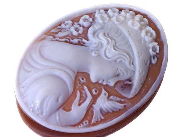 > 【ジュエリー極】フルーリオ作 お洒落な女性と小鳥の彫刻 高級シェルカメオルース 45.2mm×34.2mm w5883i【送料無料】