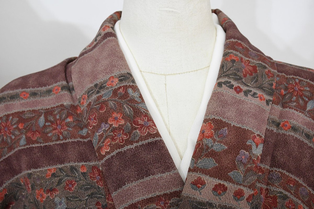 - 小紋 着物 袷 横縞 縮緬 更紗 花文様 身丈153cm 裄丈65cm ★ kb-7492 桜庭呉服店