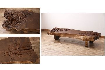 - R-048585 国産 工芸家具 総栗材 職人技が素晴らしい!凝った彫刻が魅力的な一枚板のテーブル(ローテーブル、座卓、センターテーブル)