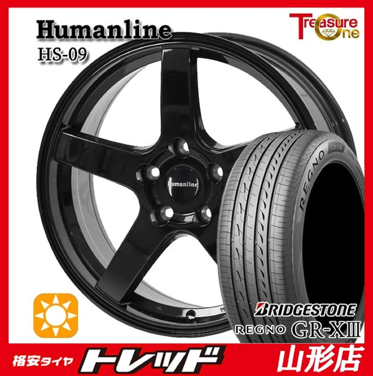 - 山形店 新品 夏タイヤホイール4本セット Humanline HS-09 17インチ 7.0j 5H114.3 +38 BK ブリヂストン レグノ GRX3 215/55R17 2025年製