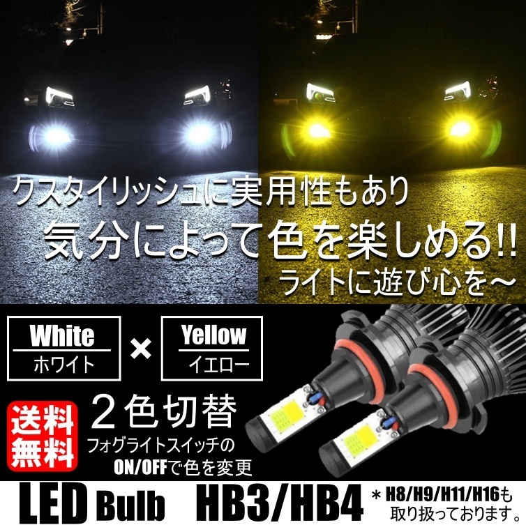 - HB3/HB4 LED フォグランプ 2色切替 カラーチェンジ 3000kイエロー/6000kホワイト LEDバルブ ツインカラー