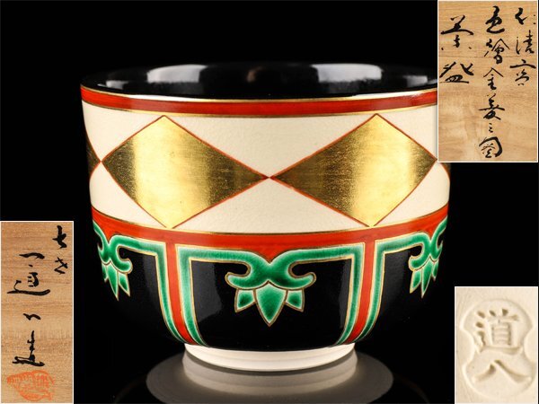 【流】七代 高橋道八 仁清写 色絵金菱の図 茶碗 共箱 UD310