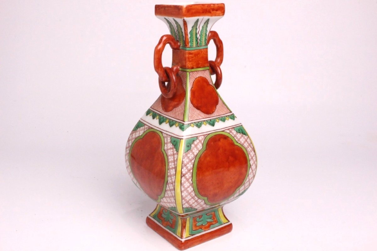 > 「狸庵RS」 京焼 三浦竹軒 作 遊環 倣明窯礬紅彩画方瓶(高さ25㎝)「共箱・共布」/ 花器 花入 花瓶 ☆本物保障☆ux2gt8j