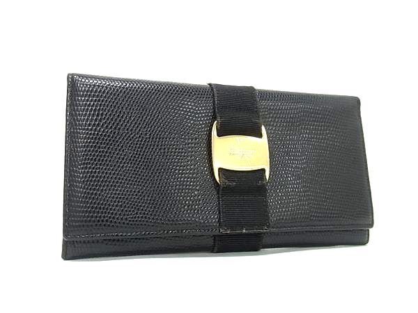 > Salvatore Ferragamo フェラガモ IR-223059 ヴァラ リザード型押しレザー 二つ折り 長財布 ウォレット ブラック系 DK8945