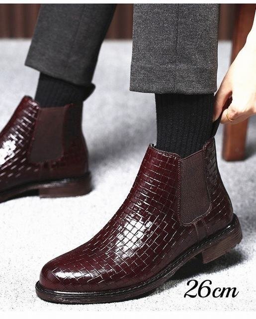 - ブーツ サイドゴアブーツ メンズ ビジネスシューズ 靴 フォーマル PU革 革靴 紳士靴 ハイカット 編み柄 ワイン 26cm