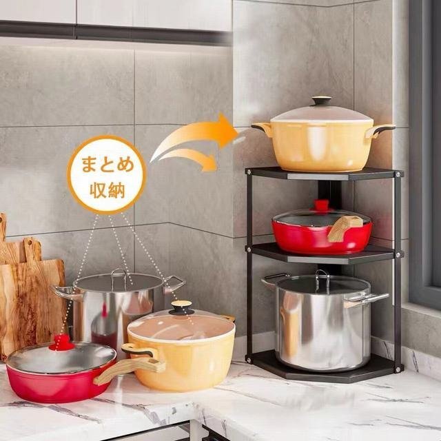 - コーナーラック 3層 フライパンラック 調味料ラック コーナー鍋置き スチールラック キッチンラック シンク下棚 隙間収納 ブラック
