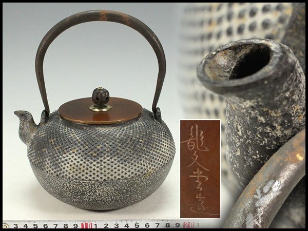 - 【金閣】龍文堂 霰肌 金銀象嵌 鉄瓶 未使用 旧家蔵出 送料無料(XA911)