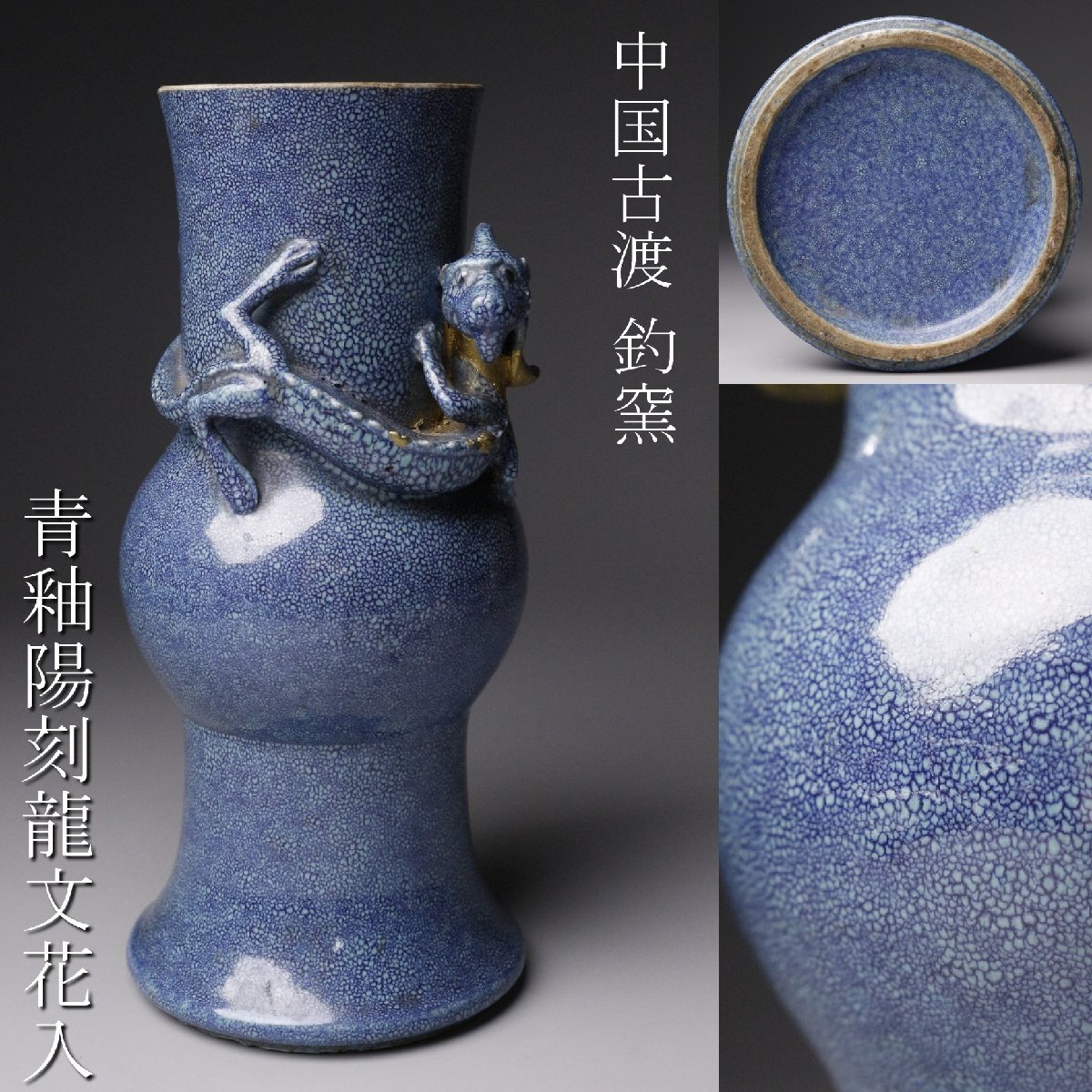 > 【LIG】中国古渡 釣窯 青釉陽刻龍文花入 20㎝ 古玩 数奇者秘蔵品 [.TP]25.10