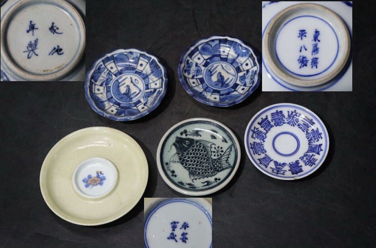 > 東陽軒 平八 染付 ・ 平安 寅蔵 黄釉 色絵 ・ 成化年製 青花 ・ 鉄絵 魚図 皿 盃台 計5点 京焼 祥瑞 中国美術 .B1394