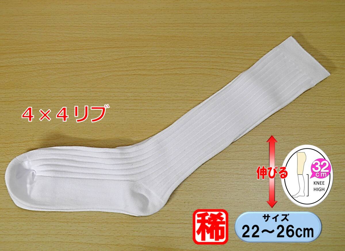 - 【レッグウェア★未使用品】白 ハイソックス◆稀少4×4リブ◆リブ スクールソックス◆伸びる22-26cm◆32cm丈◆
