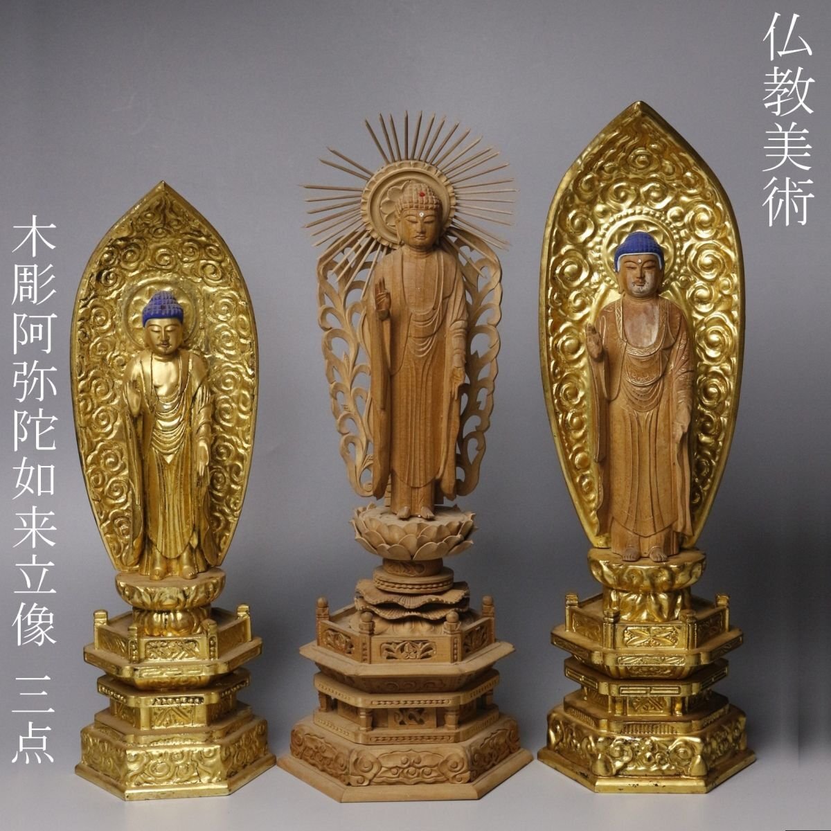 【LIG】仏教美術 木彫 阿弥陀如来立像 三点 金彩 旧家収蔵品 [.U]25.7