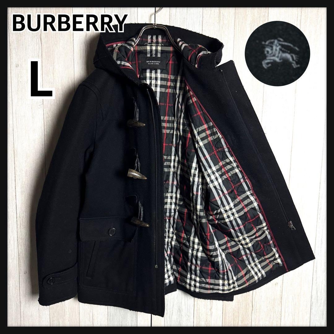 > 【希少モデル・美品】BURBERRY BLACL LABEL バーバリー ノバチェック裏地&刺繍ロゴ メルトンウール ダッフルコート ブラック・黒 L