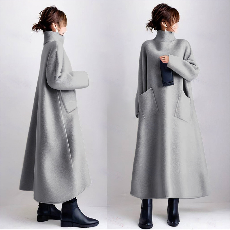 - 新入荷ラシャワンピース ラシャ ハイネック 着痩せ Aラインワンピース 上品 通勤 カジュアル風 長袖 ロングワンピース グレー