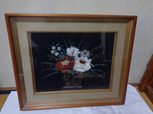- 額入り 貼り絵/花の絵/石の貼り絵?-色石・石片の貼り絵orガラスの貼り絵/材質不明/額の裏の押さえ金具が錆びで固く開きません/