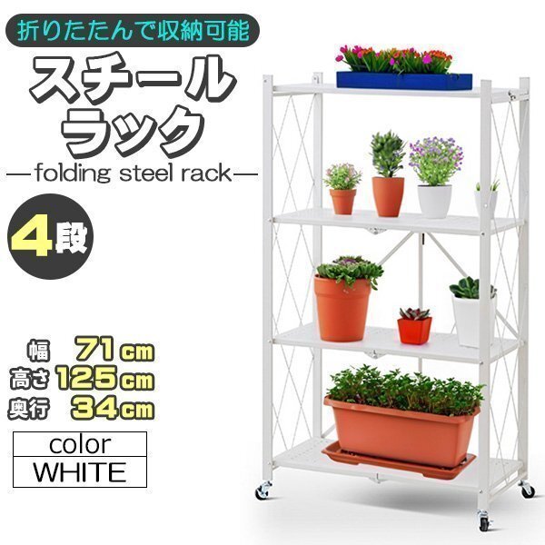 - 収納ラック 棚 金属シェルフ スチールラック メタルラック 折りたたみ 折り畳み スチール棚 キャスター付 組立簡単 頑丈 ホワイト 白 4段