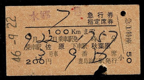 - 国鉄 鹿島線 急行 水郷7号 急行券+閑散期指定席券 佐原から 淡黄褐色券 鹿島神宮駅発行 昭和46年