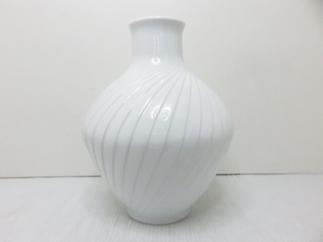 - 【未使用展示品】 天草 高浜焼 白磁彫込花瓶 ○YR-13669○