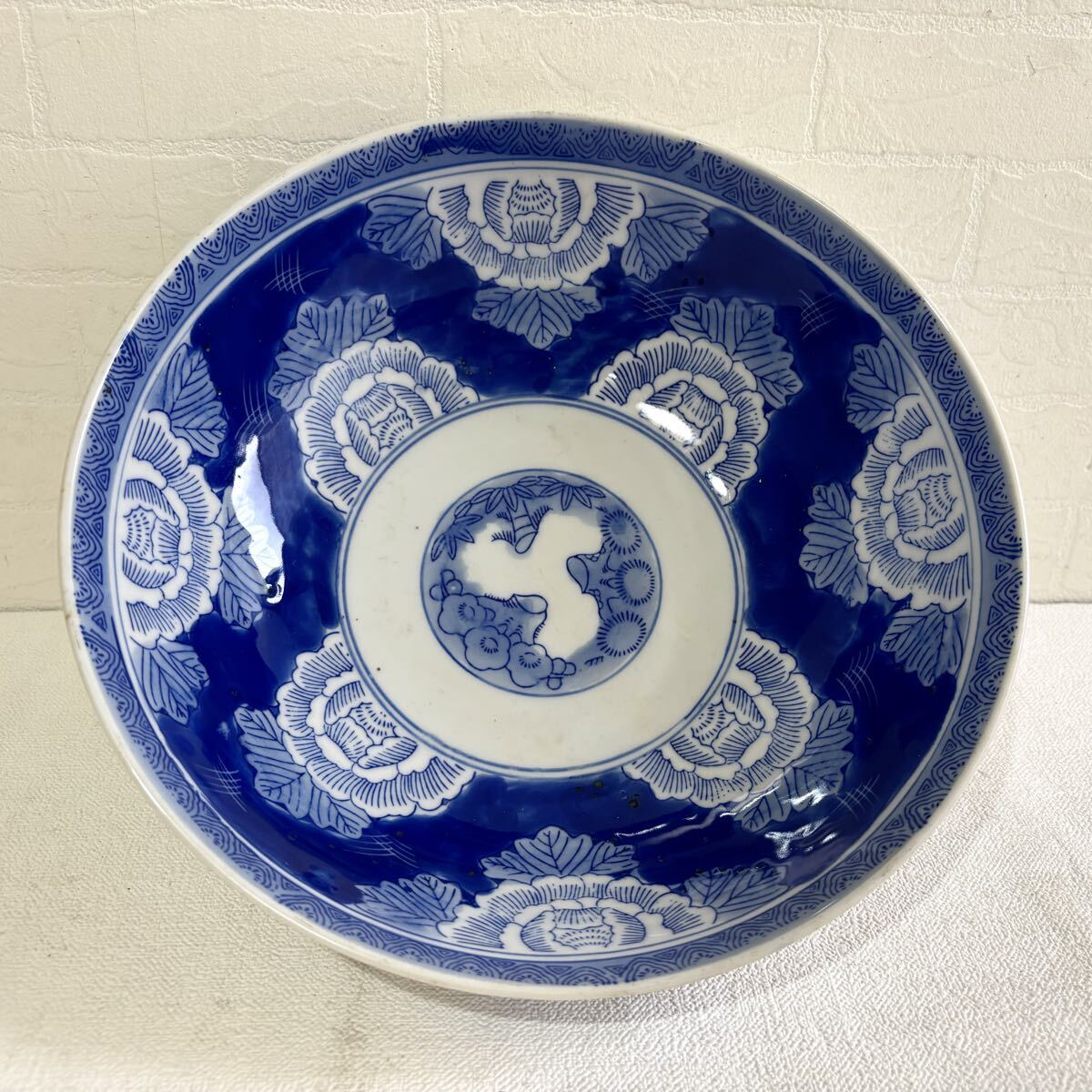 > 時代物 印判 染付 盛り皿 飾り皿 八寸 口径24cm/高さ8cm 大鉢 牡丹図 松竹梅 縁起物 旧家蔵出し 長期保管品