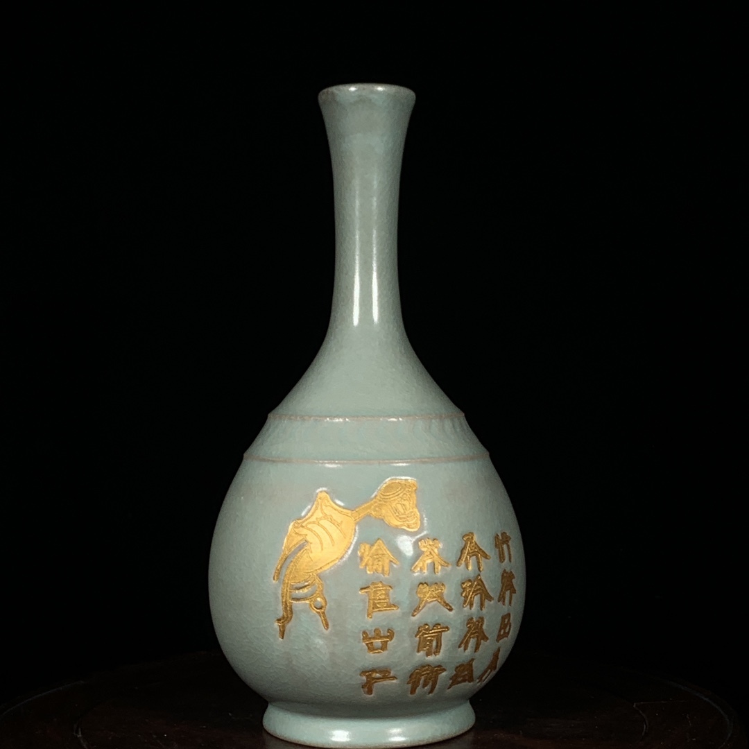 - 旧蔵 宋代 汝窯 銘文 塗金 膽瓶 古陶瓷品 陶藝 古擺件 古置物 中国古玩 骨董品 時代物 稀少唐物