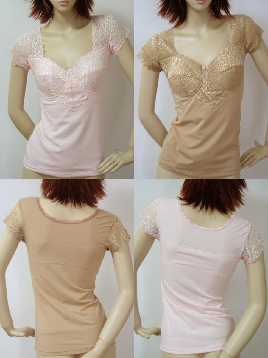 - 送料無料◆超お得◆2色×2組◆美ボディライン◆綿混素材◆脇汗パッド付き◆フレンチ袖◆ソフトカップ付きインナー(M/ピンク&ベージュ)