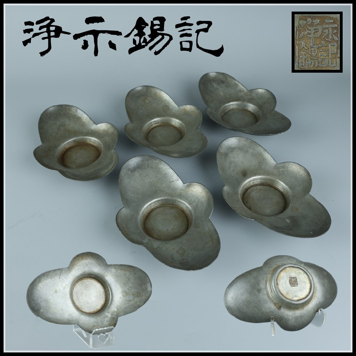 【志】K1435 茶托 5客 古錫 錫製 浄示錫記 木瓜形 中国美術 時代物 茶道具 重量328g拍卖