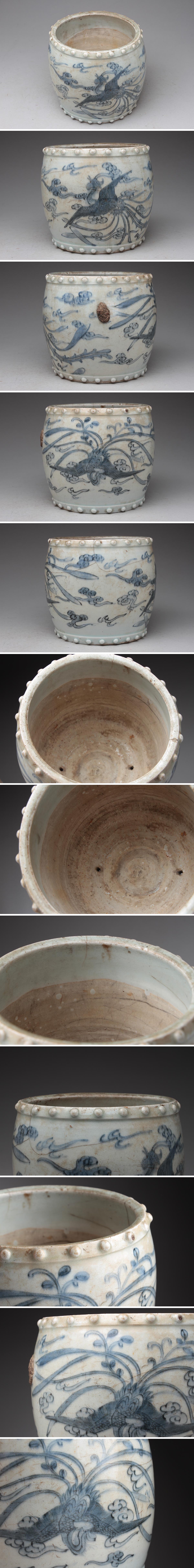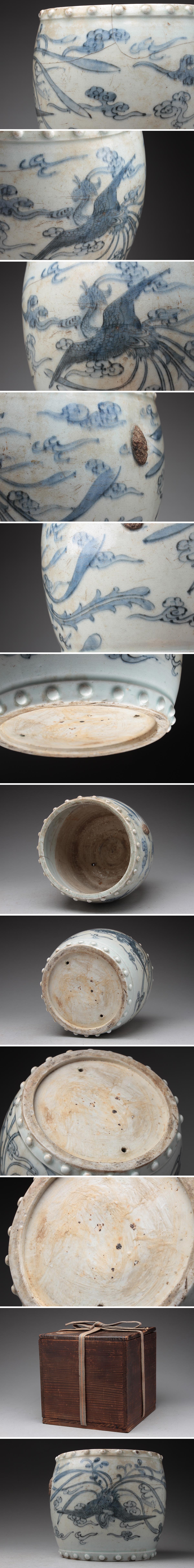 > ZM583 中国古玩 明代 染付 朱雀文 太鼓形鉢 高15.2cm 木箱附・青花云鳳凰紋花盆・植木鉢・水鉢 中国古陶磁