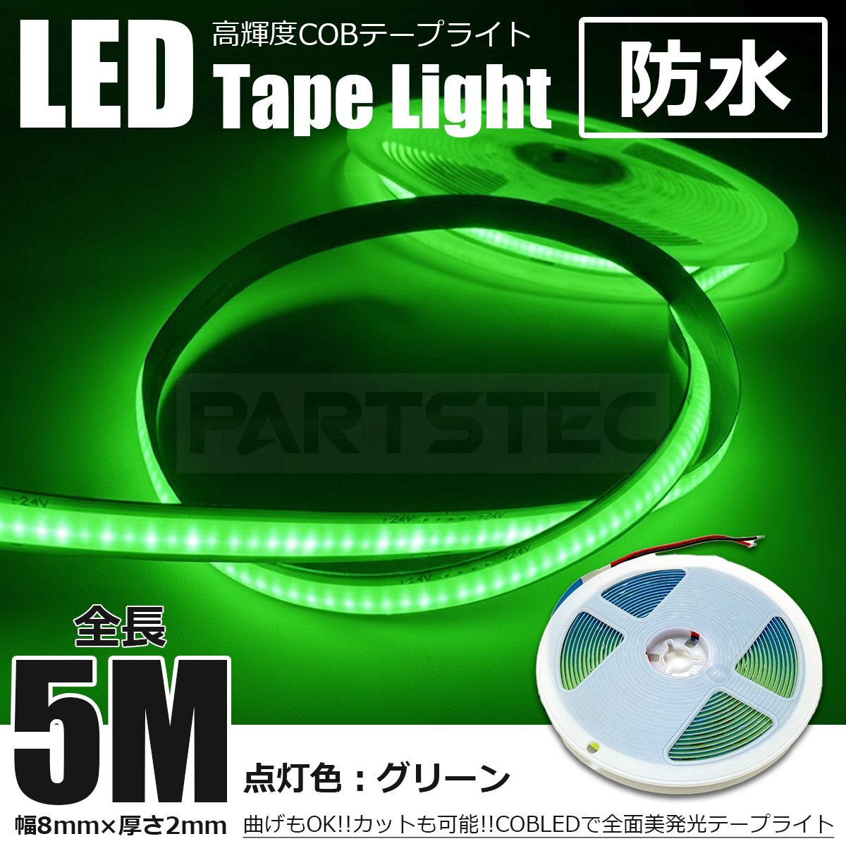 - 24V 極薄 美点灯 COB 面発光 LED テープライト グリーン 緑 5M 幅8mm 厚さ2mm 柔軟 防水 チューブライト トラック 船舶 /146-252