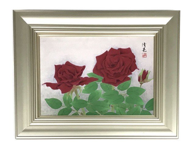 - 三田 清晃【ばら】油彩 静物画 画寸約33.5 × 約24.0 cm 額寸 約46.5 × 約37.5 cm サイン・裏シールあり