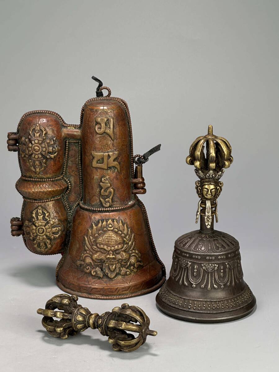 - U16S80 仏教美術 銅製 チベット 銅鈴 金剛杵 収納銅ケース付き 時代物 唐物 古物 旧蔵家出し