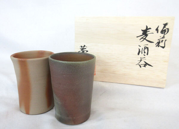 > 送料300円(税込)■lv242■備前焼 夢幻庵 麦酒呑 焼変りペアカップ 木箱入 日本製 5500円相当【シンオク】