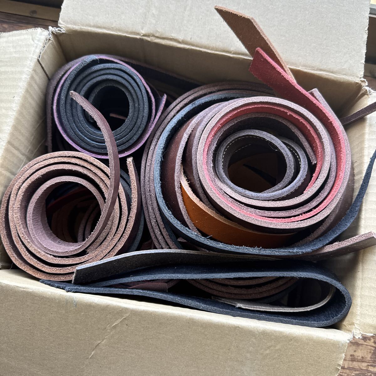 - 040802◆ベルト状裁断 端切革 レザークラフト ヌメ革 栃木レザー 姫路レザー 15、20、25ミリ幅 26×20×12センチ60サイズダンボール