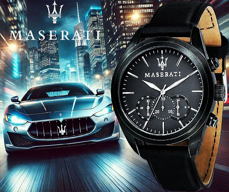 - 入手不可能 マセラティ公式時計 新品1円 三連クロノグラフ 100m防水 全身黒塗ブラック 日本未発売 本革 腕時計 MASERARTI マセラッティ